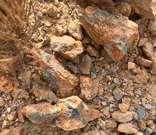 Figure 2: Sample K024547 collected from a historic rock pile at the Blue Dick area returning 6,630 g/t Ag, 0.4 g/t Au, 2.28% Cu, 2.42% Pb and >1% Sb.