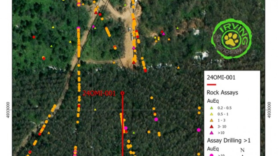 In November, immediately following the consummation of an option agreement with JX Advanced Metals Corporation ("JX") over select areas at the Omu gold project (refer to the Company's news release dated November 13, 2024), Irving, under the direction of JX, drilled a single, strategically positioned diamond drill hole, 24OMI-001, at the Omui historic mine site (Figure 1). This hole was shallowly oriented toward the south testing an area up to approximately 150m south of Honpi, the main vein that was mined during the 1930's. Beginning at approximately 35m down hole depth, hole 24OMI-001 encountered extensive quartz veining and silicification to the end of the hole at 101m. The objective of this hole was to determine if there are shallow, gold-bearing quartz veins and silicified ore that could potentially be exploited by surface mining. This work is viewed as part of the vision to make Omu into a new source of gold-bearing silica flux for use in smelters in Japan. Irving is encouraged by the visual results from this drill hole which is currently being logged, sawn and sampled for assay. During 2025, JX and Irving plan to drill an additional three such holes testing more parts of Omui for shallow veins and silicified ore.