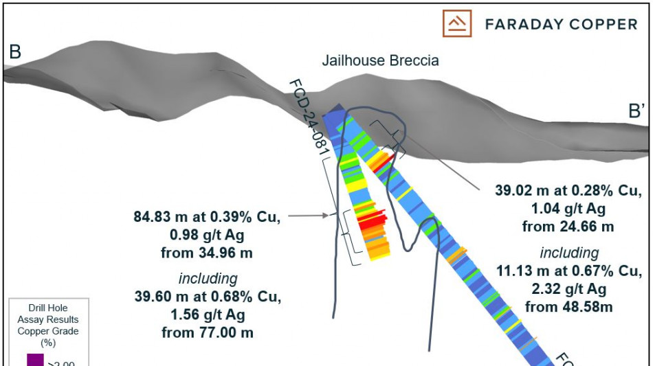 At the Jailhouse breccia, the first drill hole in this new target, FCD-24-081, intersected 84.83 m at 0.39% copper and 0.98 g/t silver from 34.96 m, including 39.60 m at 0.68% copper and 1.56 g/t silver from 77.00 m. The hole was terminated in strongly mineralized breccia due to mechanical issues. Follow-up drilling is underway.
