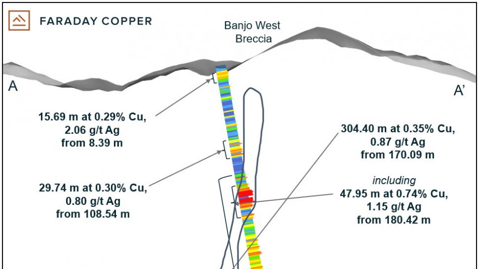 Note: The field of view represents an approximately 700-metre-thick slice. The open pit shell and underground footprint are based on constraints used in the MRE as presented in the Technical Report available on the Company's website at www.faradaycopper.com and on the Company's SEDAR+ profile at www.sedarplus.ca. For drill holes not reported herein, refer to news releases dated June 25, 2024, July 25, 2024, August 21, 2024, September 24, 2024, and October 17, 2024, November 19, 2024, and January 8, 2025