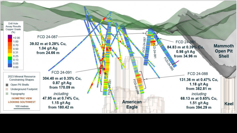 In the American Eagle area, west of the Banjo breccia, drill hole FCD-24-091 intersected 304.40 metres ("m") at 0.35% copper and 0.87 grams per tonne ("g/t") silver from 170.09 m, including 47.95 m at 0.74% copper and 1.15 g/t silver from 180.42 m.