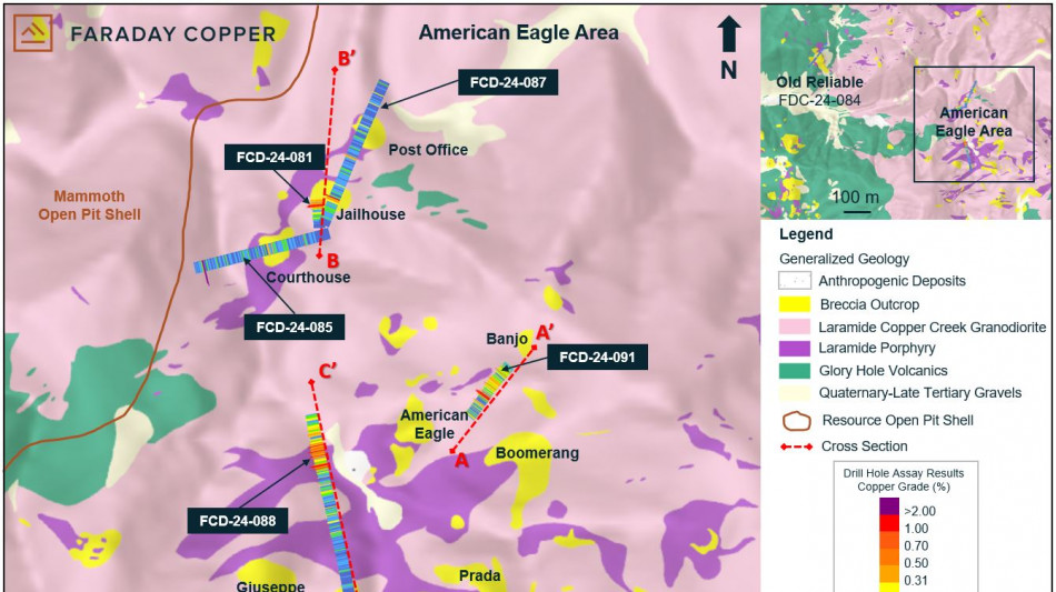 VANCOUVER, BC / ACCESS Newswire / January 30, 2025 / Faraday Copper Corp. ("Faraday" or the "Company") (TSX:FDY)(OTCQX:CPPKF) is pleased to announce the results of six drill holes from its ongoing Phase III drill program at the Copper Creek Project, located in Arizona ("Copper Creek"). Five holes were drilled in the American Eagle area and one at Old Reliable.