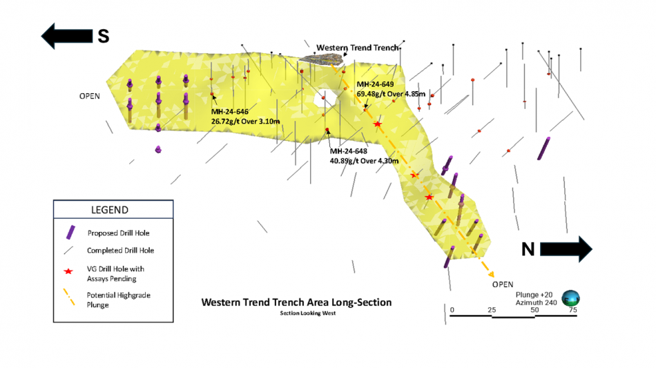 Drilling to date at the Western Trend has tested 100 m of the strike to 165 m down plunge with the zone remaining open. The deeper holes are targeting the potential high-grade plunge of the intersection point between the east-west trending splay and the main north-trending vein system.