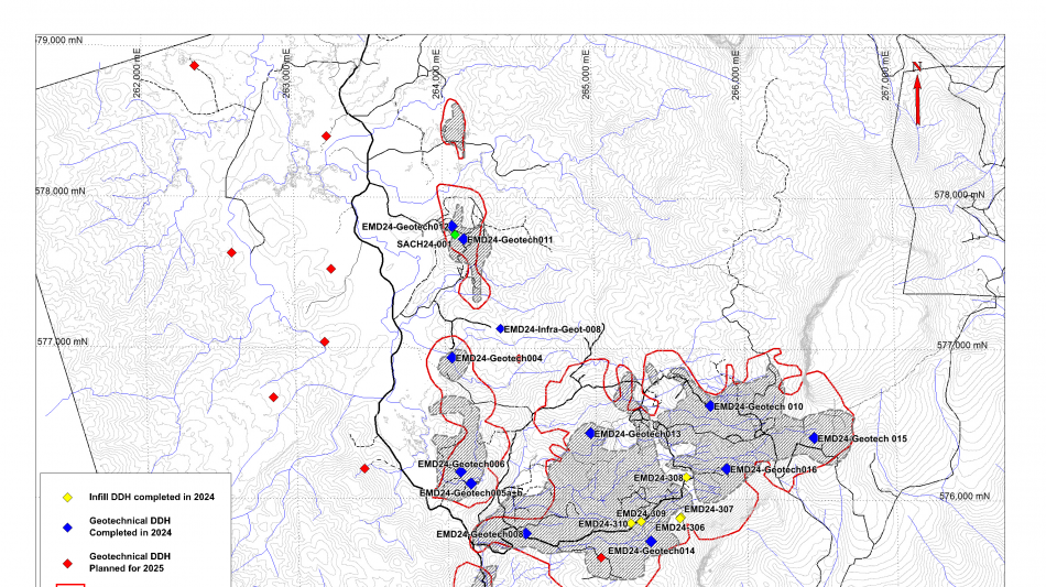EMD24-pitgeotech011, a geotechnical drill hole within the Salbora deposit intersected 3.73 g/t Au over 31.5 metres starting from 22.5 metres down hole (drilled sub-parallel to the Salbora breccia structure). The length of intersection and gold grades were broadly in line with those of the resource model and PEA pit shells.