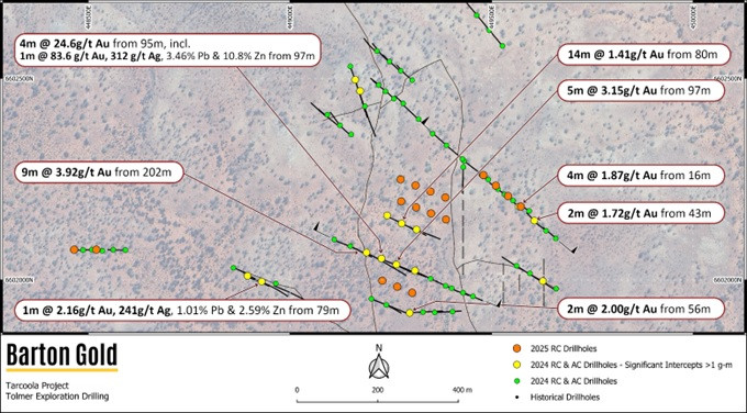 Barton Gold Holdings Limited (ASX:BGD)(FRA:BGD3)(OTCQB:BGDFF) (Barton or Company) is pleased to confirm that further RC drilling has been completed at the Tarcoola Gold Project's (Tarcoola) Tolmer prospect in South Australia. 17 RC holes were drilled for a total of 2,230 metres completed. 1 Drilling targeted potential extensions of higher-grade quartz sulphide veining, and below November 2024 aircore (AC ) drilling which intersected gold but was unable to penetrate the underlying harder quartzite rock. 1