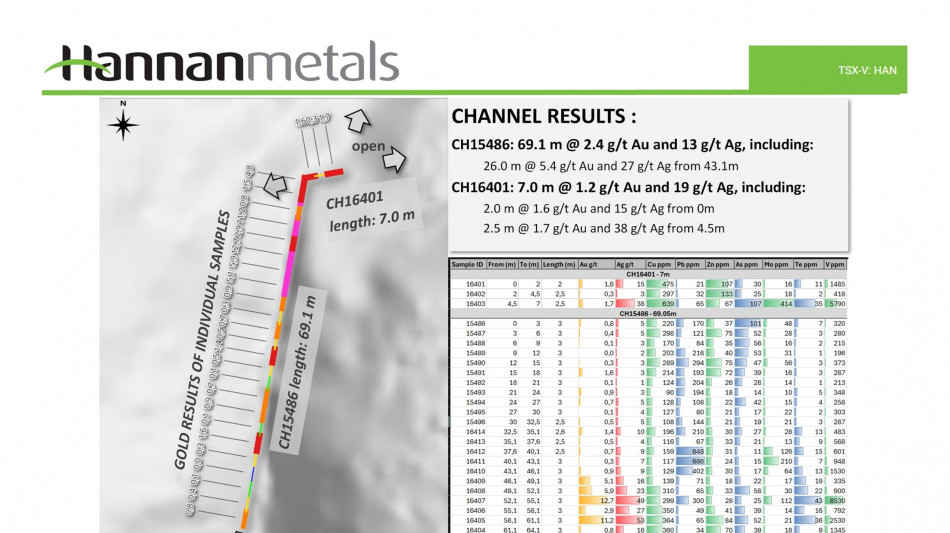 The channel remains open to both the north (4.8 g/t Au last assay) and south (0.8 g/t Au last assay) and a grab sample of outcrop located 62 m to the SSW assayed 0.8 g/t Au, 7 g/t Ag and 3.8 g/t Te