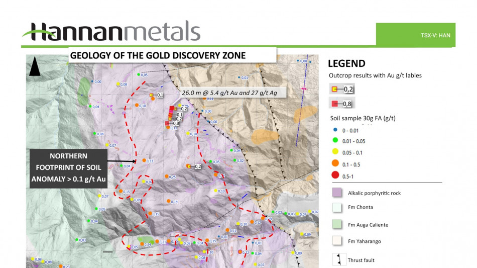 The gold mineralization was discovered during follow-up of anomalous reconnaissance high-grade rock samples (0.4 m @ 7 g/t Au). The channels are located at the northern margin of a 4 km by 4 km soil gold anomaly >0.1 g/t Au, with the majority of the anomalous zone remaining untested. The gold mineralization was trenched along a small drainage while the soil samples were collected along ridge lines.