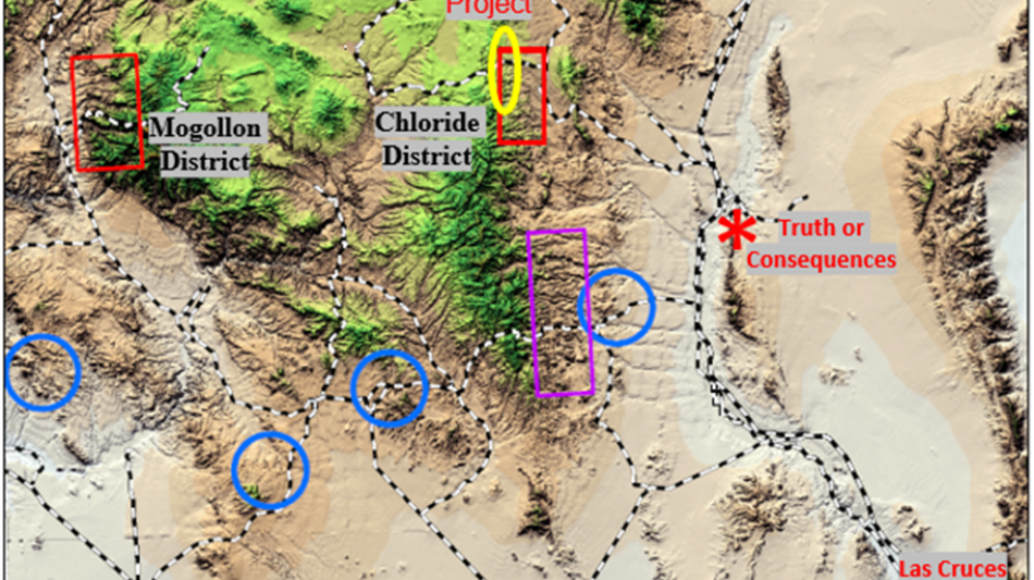 Figure 1. Winston Project (yellow ellipse) regional location map, showing the north end of Chloride District. Porphyry Copper Deposit (PCD) in blue circles; Base-Metal CRD Districts in purple rectangles; Epithermal Precious Metals in red rectangles