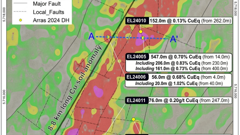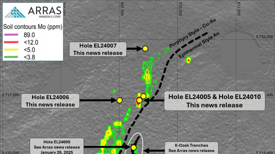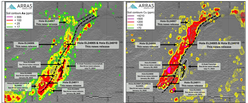 Tim Barry, CEO of Arras Minerals, commented, "We are extremely encouraged by the results of the Phase 1 drill program at Elemes. Holes EL24005 and EL24006 strongly suggest the presence of another porphyry center developing at the Berezski target. Notably, the porphyry-style mineralization identified in quartz-chalcopyrite veining in the deeper sections of EL24005 provides a solid vector for us to pursue in the Phase 2 program. Furthermore, EL24006 intersected porphyry-style mineralization approximately 1 km to the west, on the western edge of the copper soil anomaly, giving us follow-up targets between the two holes, as well as to the west, north, and south-even beyond the current anomaly boundaries."