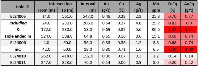 EL24005: 547m of mineralization grading 0.70 % copper-equivalent ("CuEq") (0.23% Cu & 0.48 g/t Au), starting from 14m depth; including: