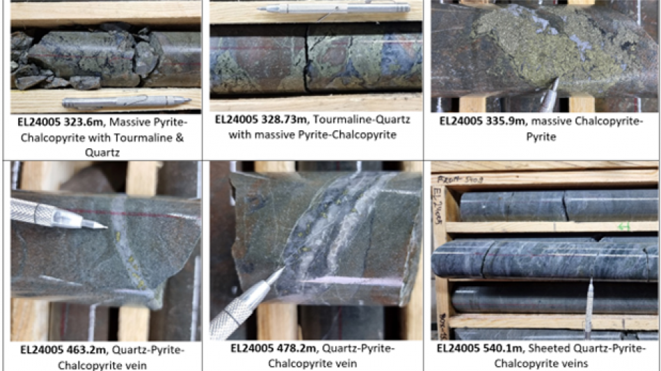 Drill hole EL24006 was drilled approximately 1km to the west of hole EL24005. This hole appears to have identified another target with porphyry style mineralization and alteration. The hole intersected propylitic altered diorites that have been partially overprinted by argillic alteration. Mineralization is present as quartz-pyrite-chalcopyrite porphyry-style veins, with disseminated pyrite and chalcopyrite.