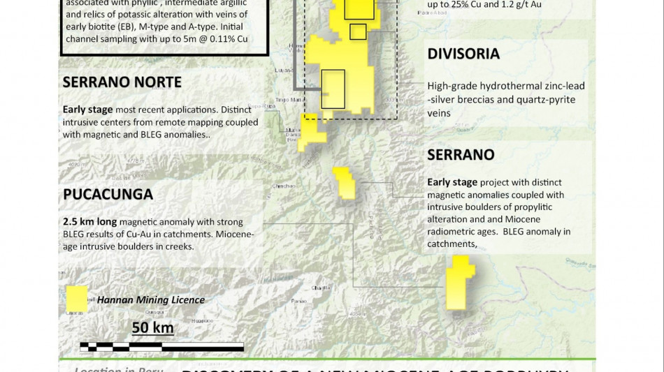 The Belen prospect (Figure 2) is situated within Hannan's Valiente project, which has identified a new Miocene-age porphyry copper-gold belt in Peru's central eastern region. Recent geophysical surveys have defined significant anomalies at all three main targets:
