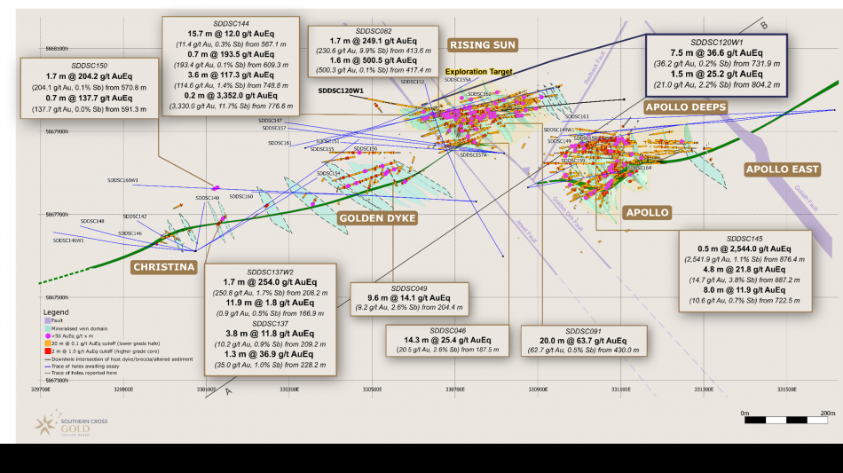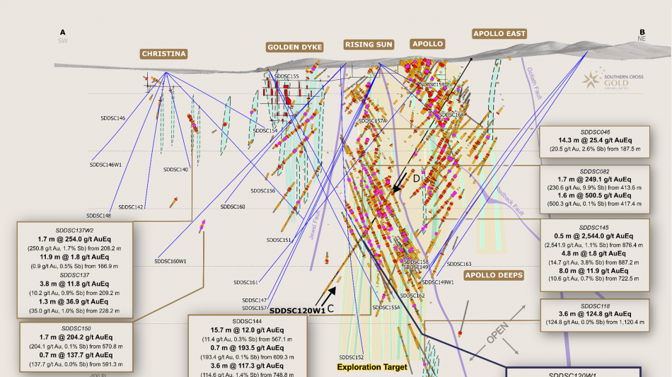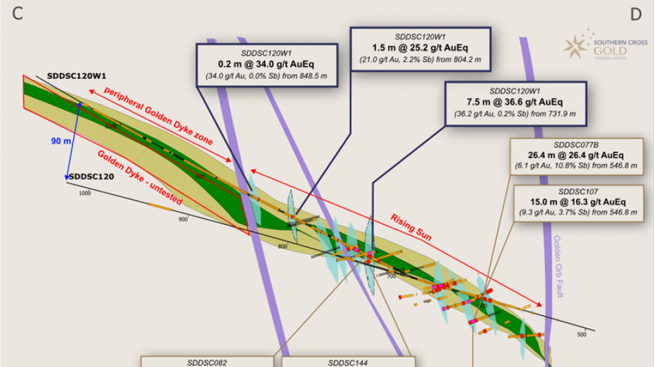 SDDSC120W1 was drilled east to west as a daughter navigational hole from the parent SDDSC120 ( 23 July, 2024 ) with the intention of targeting the northern strike extent of several vein sets within the western portion of the Rising Sun prospect. The drill hole successfully tested a prospective corridor of 347 m @ 1.2 g.t Au (uncut) (ie the cumulative downhole length of dyke/breccia/altered sediment between the "rails of the ladder") and intercepted six mineralized vein sets , two of which were previously unknown (the "rungs of the ladder"). The hole contained six intervals >20 g/t Au (up to 464.0 g/t Au) and five intervals of >2% Sb (up to 17.5% Sb) . The hole intersected three modelled vein sets, and defined three additional previously unmodelled vein sets one of which lies outside the exploration target area.