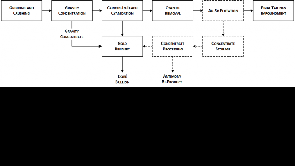 Depicted in the simplified process schematic, the process strategy involves conventional, industrially proven technology, is applicable to all material types, with a focus on maximizing Au recovery to doré bullion, while enabling the potential for bi-product recovery of Sb values from secondary treatment of an Au-Sb concentrate.