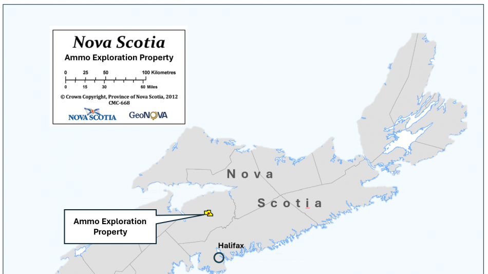 Armory holds an option agreement to acquire 100% interest in the 3,092-hectare Ammo Exploration Property which is located adjacent to and surrounding the past-producing West Gore antimony-gold mine in central Nova Scotia, located approximately 45 kilometres north-northwest of the provincial capital of Halifax (Fig. 1). Production from the adjacent historical West Gore antimony-gold mine dates from the early 1880s to 1917. The historical mine workings and subsequent evaluations include multiple shafts, eight underground levels and at least 70 drill holes.