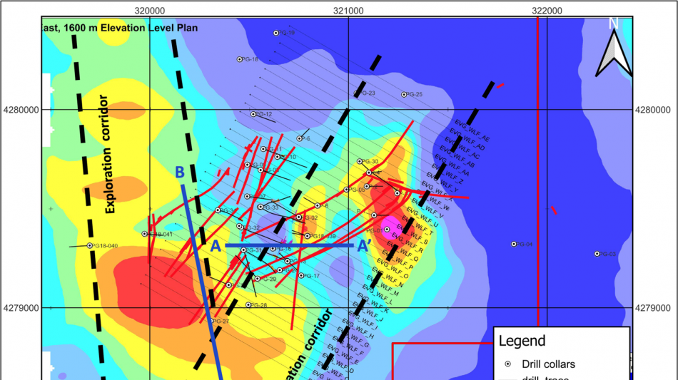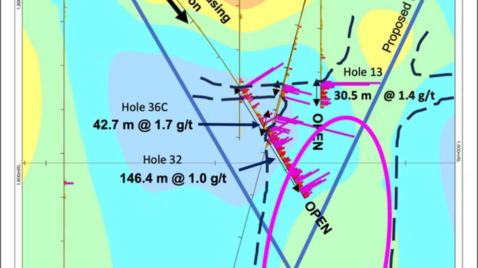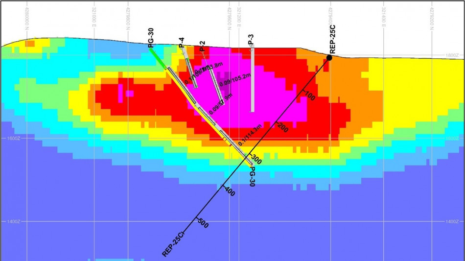 Drilling is planned to test the down-dip extension of hole PG-32, that returned 146.4 metres grading 1.0 g/t AuEq (see Figures 2 and 4). The hole PG-32 intercept lies along the northern edge of an 800 metre long, steep west-dipping CSAMT anomaly (Controlled-Source Audio-frequency Magnetotelluric) which is interpreted to represent a northeast-trending structure, an area of increased felsic volcanism and intrusions, and an area where hydrothermal fluids upwelled into structural and stratigraphic targets. This interpretation is supported, in part, by a hyperspectral scan of rock chips from hole PG-32, which indicated an increase in potassium illite content, corresponding with higher temperature alteration, to the end of the hole. It is believed that hole PG-32 was drilled just above a bonanza-type gold system or may have been stopped too soon. The first hole will be drilled from west to east to intersect the interpreted mineralized system approximately 75 metres below hole PG-32. Depending on results and validation of the orientation of the mineralized system, another hole may be drilled to test the target area from east to west. This follow-up hole could also determine if the interpreted mineralized system extends upward, closer to surface.