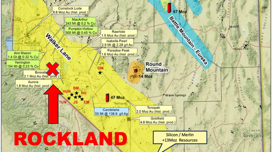 TORONTO, ON / ACCESS Newswire / February 25, 2025 / Wolfden Resources Corporation (WLF.V) ("Wolfden"or the"Company")is pleased to provide an update with respect to its Rockland Project where the company can earn up to a 75% interest in the property that is located in the Walker Lane Trend of Nevada, USA. The company plans to commence an 1,800 metre drill program in July 2025 to test for rhyolite-hosted 'bonanza-type' gold mineralization, which modeling suggests may potentially occur just below historical drill results that included 146.4 metres at 1.0 g/t AuEq* in hole PG-32 and 42.7 metres at 1.7 g/t AuEq* in hole PG-36C. With a drill permit that requires only on-site final approval and funding available from the Company's recent land sale in Maine that has been conditionally approved by the TSXV, Wolfden is well positioned to drill test several bonanza-type gold targets within the large Rockland East hydrothermal system. An analogous target model is AngloGold's major new Silicon-Merlin discovery located in the Bullfrog District further to the southeast along the Walker Lane trend, which hosts Indicated-level mineral resources of 121 mT for 3.4 million ounces of gold and Inferred mineral resources of 391 mT for 12.9 million ounces of gold1.