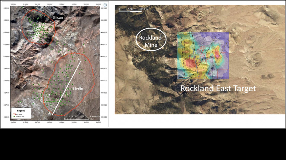 The overall size of the Rockland target area also compares favorably with that of AngloGold Ashanti's Silicon-Merlin deposit area(see Figure 3). Rockland comprises a large area of hydrothermal alteration cut by numerous quartz-adularia veins that display low to bonanza-type gold grades along with enriched silver, arsenic and antimony levels, that warrants additional drilling.