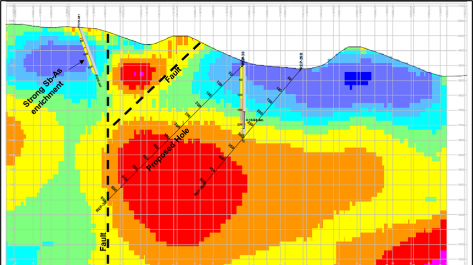 A second hole is proposed to test a large CSAMT anomaly below an area of outcropping epithermal quartz-adularia veins that returned elevated antimony, arsenic and gold (see Figures 2 and 5 for the section location and proposed drill section). This anomaly has never been tested and is interpreted as a potential area where gold-enriched hydrothermal fluids ponded both within, along side and below silicified rhyolites. This large target area lies near the intersection of northerly and northeast-trending CSAMT high resistivity structures.