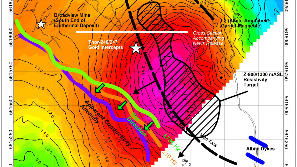 ESTES PARK, CO / ACCESS Newswire / February 25, 2025 / Taranis Resources Inc. ("Taranis" or the "Company") (TSX.V:TRO)(OTCQB:TNREF) is providing the second in a series of News Releases that detail exploration for a deep, underlying mineralized intrusive body at Thor. This News Release documents two drill holes (Thor-246 and Thor-247) that were drilled from a single setup 0.6 km southeast of the Broadview Mine. Both drill holes returned anomalous gold (up to 0.452 g/t Au) over substantial widths. These intercepts were drilled west of the Z-900/1300 anomaly (see attached plan map) and provides compelling information that the main body of the feature is mineralized. Taranis has provided a cross-section of these drill holes that shows the location of the section relative to the important geophysical anomalies, and it appears on the website www.taranisresources.com