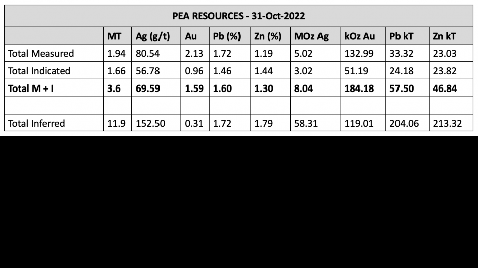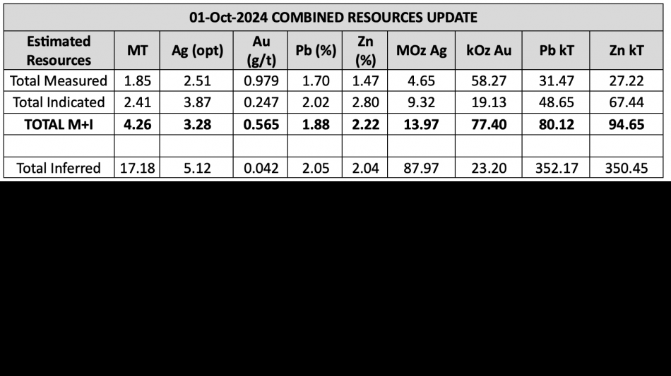 Recoverable inferred resources of 5.394 MT at 4.82 opt Ag, 3.35% Zn, and 1.98% Pb.