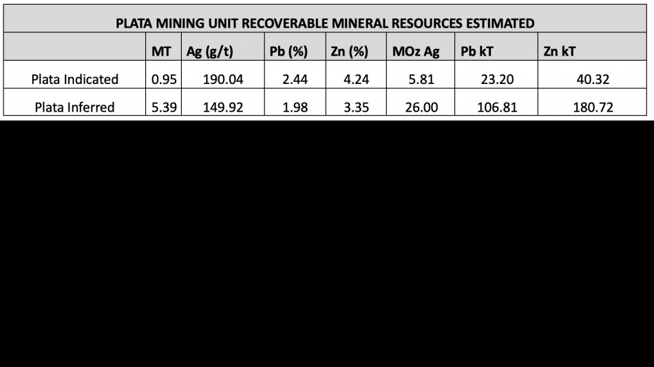 Plata Mining Unit is a high-quality, historical, operating target with indicated recoverable resources of 0.951 MT at 6.11 opt Ag, 4.24% Zn and 2.44% Pb.