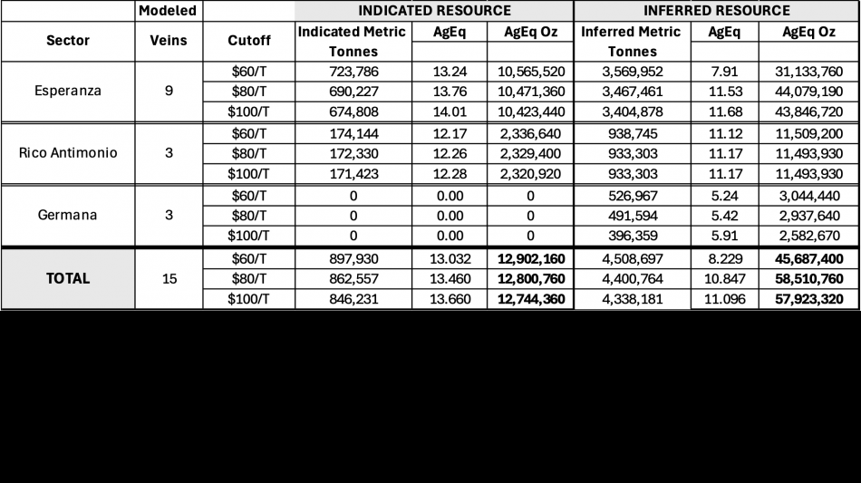 Future work will prioritize expanding the lateral and depth extents of the resource. The vein has been mined historically by selective methods, with cut-off grades exceeding 16 oz AgEq per tonne.