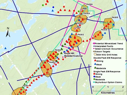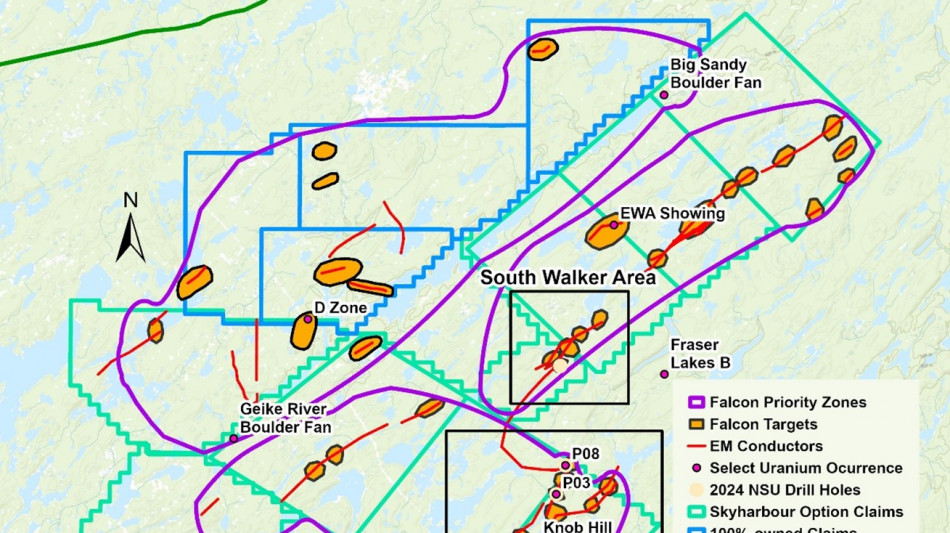 To date, North Shore has identified 36 uranium targets at Falcon. The targets are associated with electromagnetic ("EM") conductor anomalies and have been selected based on the analysis and interpretation of multiple datasets by North Shore and its consultants. As reported on May 16, 2024, the Company discovered near-surface uranium mineralization at P03 and P08 at two of these targets, FA033 and FA006, respectively, in an area that had never seen drilling (Figure 2). The Company believes that these new uranium occurrences could be part of a new trend of uranium mineralization that could extend to the south-southwest and to the west-northwest. The Company's near-term focus is to assess the potential for an economic uranium deposit in this area by evaluating priority near-surface EM targets in the South Priority Area at the eastern end of Zone 1 and the South Walker area at the southern end of Zone 2 (Figure 1).