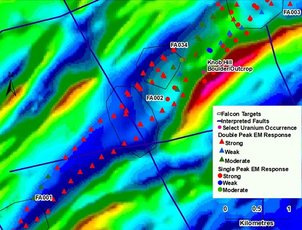 Within the potential mineralized trend, targets FA003 and FA004 offer the potential to extend the occurrence of mineralization along the conductor system. At FA003 the EM conductor system and an associated magnetic low are disrupted and the system splits, with one arm going to the northeast, the other to the north-northeast. In addition, there is a gravity low anomaly which can be an expression of alteration that could be associated with uranium mineralization (Figure 3). At target FA004, which is 1.5 km north of FA003, the conductor is offset near the intersection of two interpreted crosscutting faults.