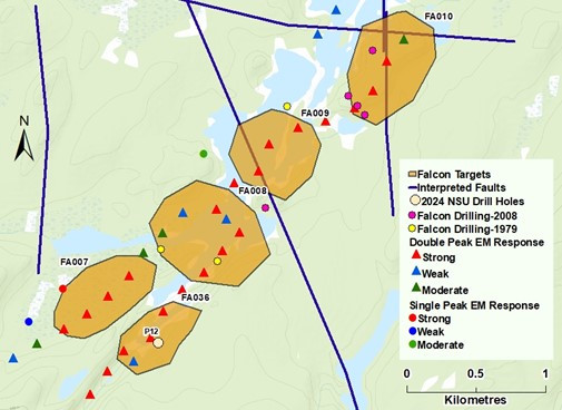 The five holes drilled by JNR Resources within target FA010 from four sites in 2008 did not encounter significant mineralization despite the compelling characteristics of the EM conductor. A strong gravity low anomaly was identified by North Shore from the 2022 airborne gravity survey. This anomaly coincides with the EM conductor and an interpreted north-south-trending fault (Figure 5). The geophysics and drilling results are being studied to determine if more drilling to intersect the gravity anomaly is warranted.