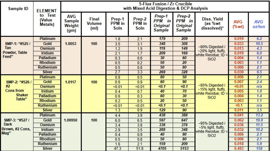 These Values in oz/ton (ounces per ton) and PPM (grams per ton equivalent) are generated using uniquely comprehensive analytical technology designed to fully digest these Mineralogical materials and quantitatively dissolve all the Precious Metals for accurate weights