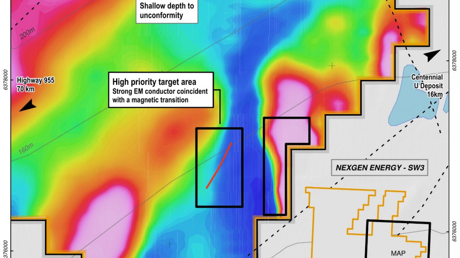 Three priority target areas with signatures consistent with potential uranium deposits were identified by Condor Consulting Inc. using archived versatile time domain electromagnetic (VTEM) and magnetic data.