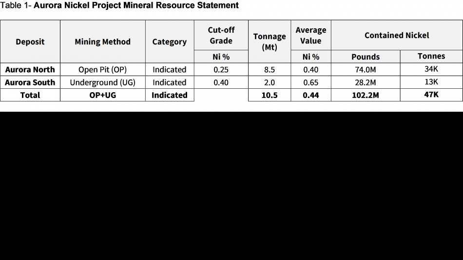 The MRE contains an Indicated Mineral Resource of 10.5M million tonnes ("Mt") at an average 0.44% Ni grade. The Aurora Nickel Project, incorporates the Aurora North and Aurora South Deposits. The Aurora North contains an Indicated Mineral Resource of 8.5 Mt at an average 0.4% Ni grade, likely mined by open-pit and the the Aurora South contains an Indicated Mineral Resource of 2.0 million tonnes ("Mt") at an average 0.65% Ni grade, likely mined with an underground method.
