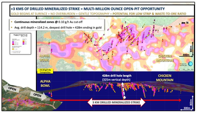 3 kms of drilled mineralized strike: the southernmost drill hole at Alpha Bowl is over 800m from nearest Chicken Mountain drill collar location (DDH97-02CM), which intersected 4.57 g/t Au over 7.01m With the completion of the 2024 drilling at Alpha Bowl, the total length of mineralized drilled strike at Chicken Mountain is over 3 km and remains open along strike and at depth.