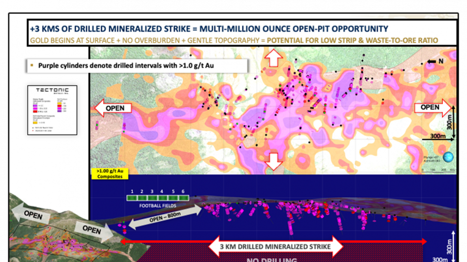 Tectonic presents the higher-grade results (65.53m at 2.13 g/t Au, including 18.29m of 5.92 g/t Au) to illustrate the coarse nature the gold at Alpha Bowl. These exceptional grades reinforce Tectonic's confidence in the Alpha Bowl system, suggesting the presence of bonanza-grade zones and a higher gold value per tonne-both critical factors in enhancing the economic potential of a deposit.