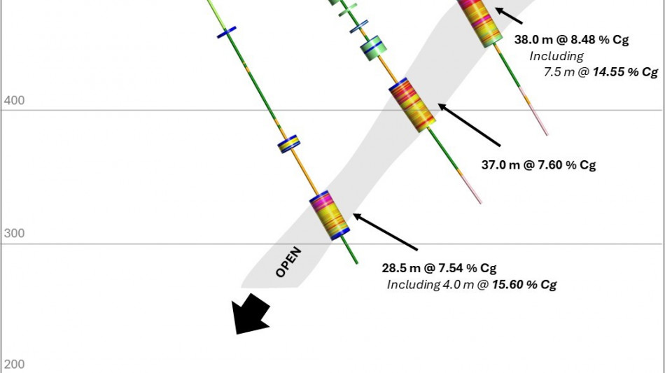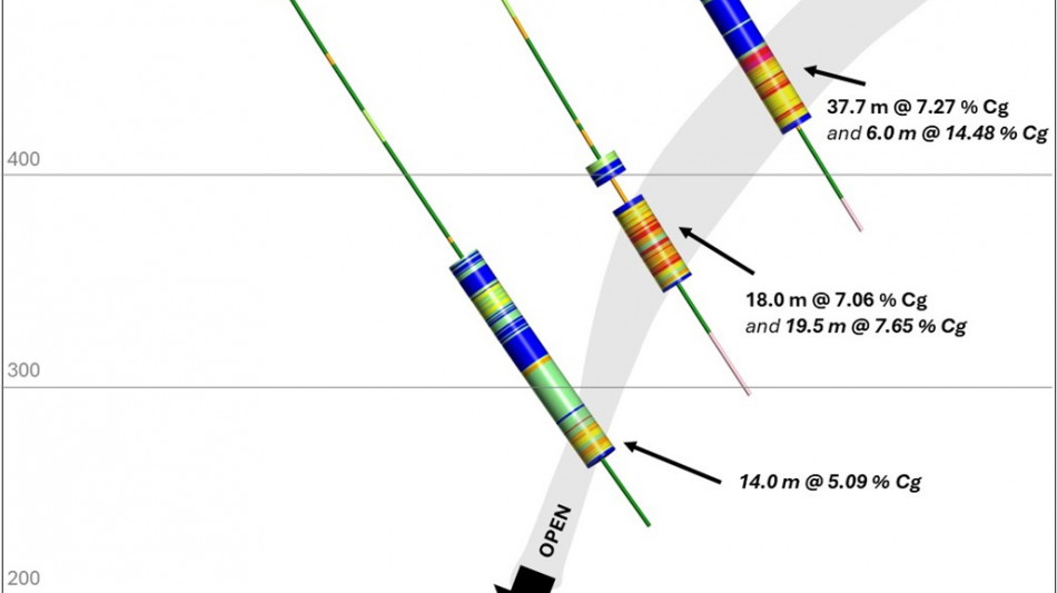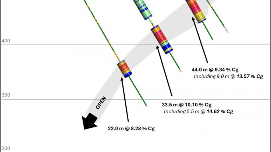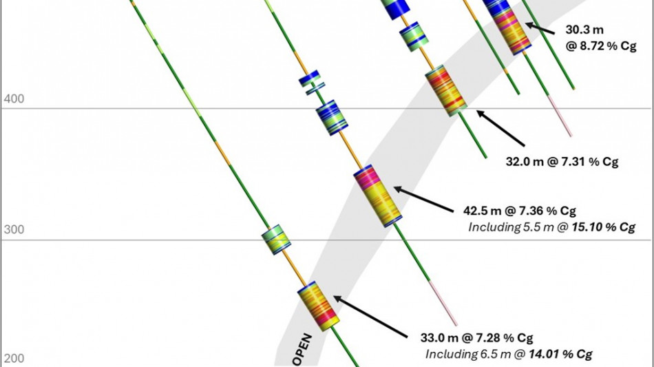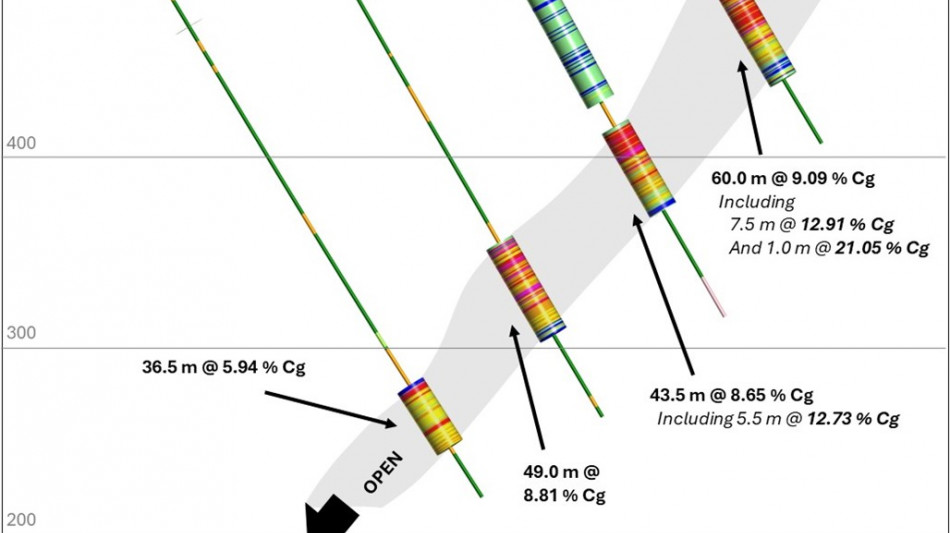 KLS-24-043: 60.0 m at 9.01 % Cg, including 7.5 m at 12.91 % Cg and 1.0 m at 21.05 % Cg
