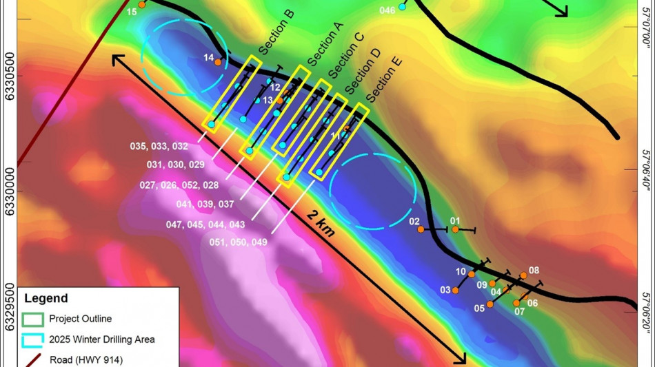 Figure 2: Map of the area around the Loki Flake Graphite Zone area showing the 2016 and 2024 drilling and 2025 winter drilling areas. Drillholes KLS-24-042 and KLS-046 intersected a new prospective graphite zone northeast of the Loki Flake Graphite Zone. Yellow outline: Cross-sections A through E, included in this release.