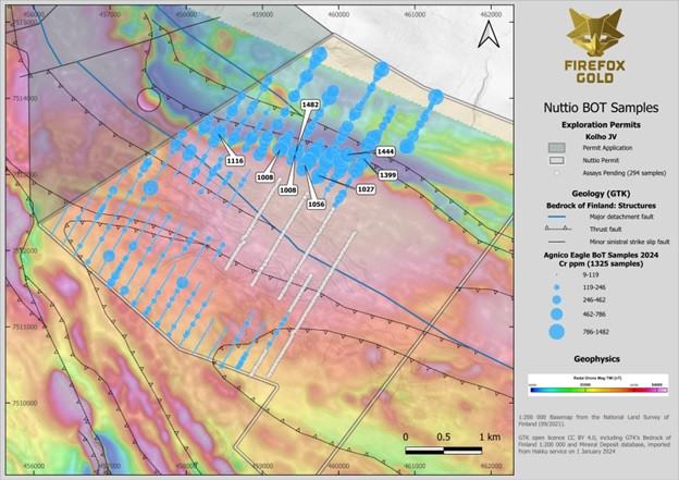The elevated chromium values, with a maximum value of 1,482 parts per million, form a cluster more than 1.1 km in length and 500m in width (Figure 2), which is believed to represent the peridotitic komatiites of the Sattasvaara formation of the Proterozoic aged Savukoski Group. According to the Bedrock of Finland Geological Database (1:200,000 scale) (Geological Survey of Finland, 2024), these ultramafic rocks are associated with most of the gold occurrences along the Sirkka Line, as well as at the Ikkari and Pahtavaara deposits owned by Rupert Resources Ltd. In addition to the encouraging gold and pathfinder element anomalies, the BoT sampling results indicate the potential for copper-nickel sulphide deposits within the Nuttio permit area, which can also be enriched in platinum group elements.