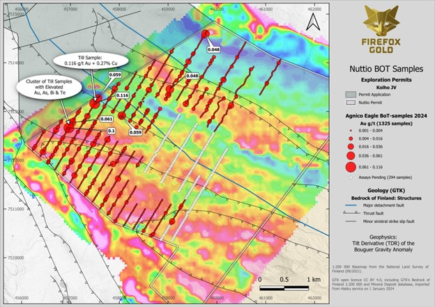 FireFox CEO, Carl Lofberg, commented on the update on the Kolho Property, "We are pleased with the steady ongoing work at Kolho. The tenement package is large and highly prospective, so it is important to see the application of large-scale systematic exploration on the ground. Even though this was the first year of activity on the first permit, it is encouraging to see gold and pathfinder element anomalies from the base-of-till sampling, and the geophysics is confirming our general interpretation of the structural setting and prospectivity. It is also not surprising to see further evidence for ultramafic rocks on the property with potential for Cu-Ni-PGE deposits. We look forward to seeing the pace of work increase in 2025 with the addition of a second base-of-till sampling rig and ongoing gravity surveys moving to the recently approved exploration permits."