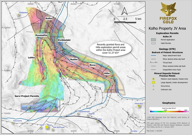 During 2024, the Finnish Safety and Chemicals Agency (TUKES) granted two additional exploration permits within the Kolho Property, southeast of Nuttio: Rova and Hilla. Together, these newly approved permits cover approximately 51 km2 along the major thrusted contact zone (Figure 3). Three additional applications for exploration permits, to the north of Nuttio, remain in progress at Kolho.