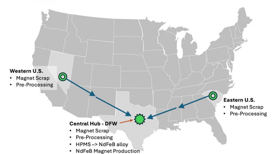 The Project is based on development of a state-of-the-art 40-year rare earth magnet recycling and manufacturing facility in Dallas-Fort Worth, Texas, capable of producing up to 750 metric tons payable of sintered NdFeB magnets and 291 metric tons of associated neodymium iron boron (NdFeB) co-products (total payable capacity - 1,041 metric tons NdFeB) annually. The potential recycling and manufacturing site is approximately 100,000 square feet in area, 36 feet in height and utilizes a pre-existing light industrial storage unit with basic utilities fully installed.