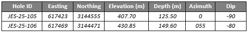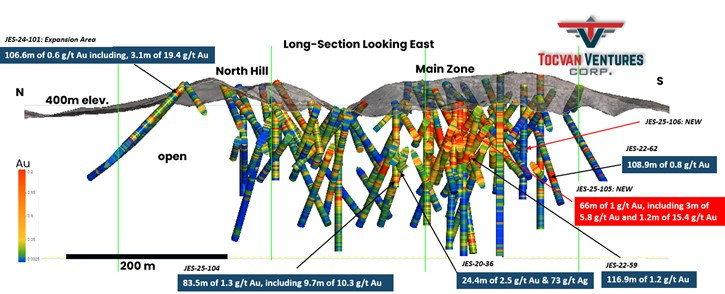 1.6 g/t Au over 36.3 meters from surface within 66 meters of 1.0 g/t Au (Hole JES-25-105)