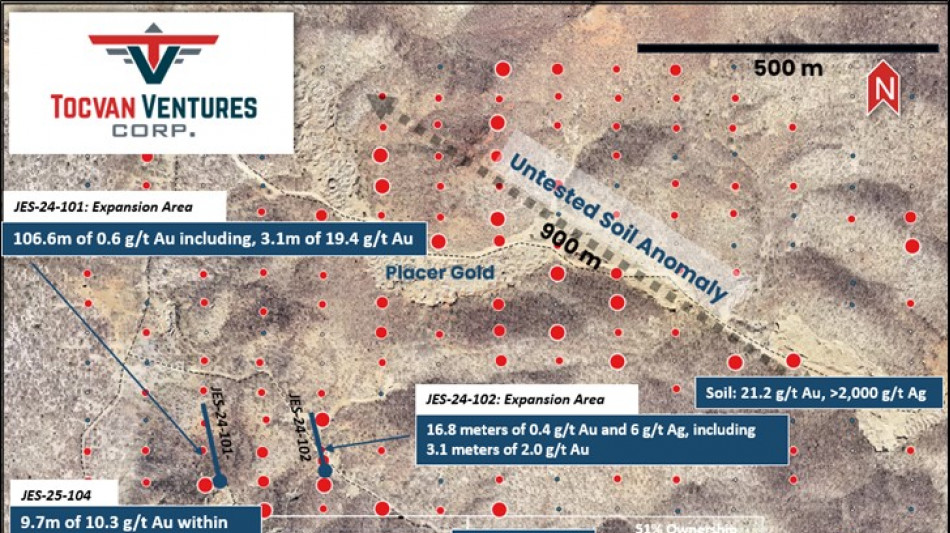 CALGARY, AB / ACCESS Newswire / March 19, 2025 / Tocvan Ventures Corp. (the "Company") (CSE:TOC)(OTCQB:TCVNF)(WKN:TV3/A2PE64), is pleased to announce results from the latest core drilling at the Gran Pilar Gold Silver Project in mine-friendly Sonora, Mexico. Ten core drillholes totaling 1,167.5 meters were completed earlier this year within the majority owned (51%) Main Zone held in partnership with Colibri Resource Corp. Today's results are highlighted by 1.6 g/t Au over 36.3 meters from surface, including 15.2 g/t Au over 1.2 and 5.8 g/t Au over 3.0 meters, starting from 9.0 meters vertical depth (JES-25-105). Mineralization correlates with at surface mineralization and lies within a broader anomalous zone drilled that averages 0.7 g/t Au over 97.4 meters. The result from JES-25-105, is a notable improvement from local historic drilling that returned 76.6 meters of 0.5 g/t Au (hole J-7) and 83.8m of 0.5 g/t Au (hole JESP-10), both drilled vertical from surface. To the southeast 100 meters, core hole JES-25-106 returned anomalous mineralization from surface to 122.2 meters depth with the most significant interval returning 3.45 meters of 0.4 g/t Au. Mineralization is known to weaken through this zone. More testing is required to determine the orientation of higher-grade zones known to occur in the area. Results for four core drillholes have now been released, results are pending for the remaining six holes.