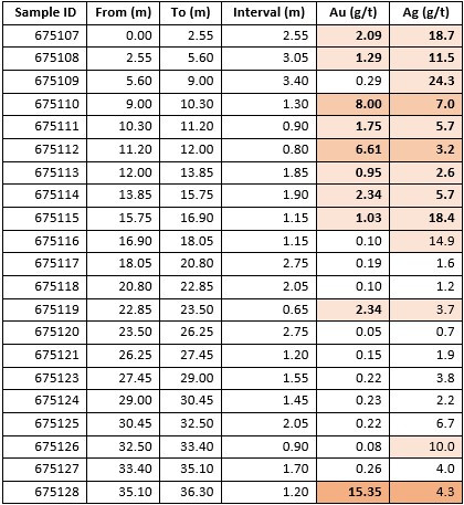 41.2m @ 1.1 g/t Au, including 3.1m @ 6.0 g/t Au and 12 g/t Ag ;