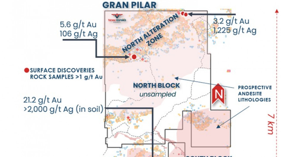 Figure 3. Gran Pilar Project Overview, > 22km2 of prospective ground with two primary targets: South Block, the direct extension and expansion of the historic Main Zone defined by an expanding vein field of untested drill targets; North Block a 3.2-km by 1.5-km pyrite and clay alteration zone that coincides with high-grade gold-silver, the area remains largely untested.