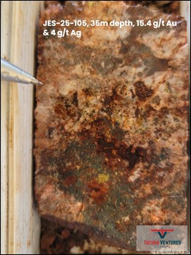 Photo 1. Close up of high-grade gold sample (JES-25-105, 1.2 meters of 15.4 g/t Au and 4 g/t Ag, from 35.1m depth vertically from surface).