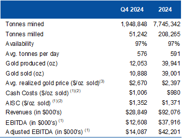 The Company's financial results for Q4 2024 reflect record gold sales of $28.9 million, which generated $14.7 million in Mine Operating Cash Flow (1) (4), and $4.7 million in Net Income after accruing a non-current deferred tax liability of $3.2 million due to greater than expected operating income consuming a greater than expected portion of the Company's deferred tax assets. The Company sold 10,888 oz of gold at an average price of $2,670 per oz with a $1,352 All-In Sustaining Cost ("AISC") ($/oz sold). (1) (2)