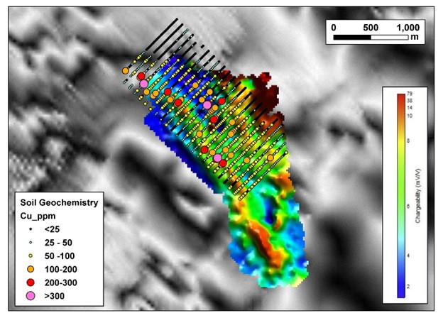 Induced polarization surveys have been conducted by the Company's in-house team utilizing its GDD GRx8-16c receiver and 5000W-2400-15A transmitter. Results are sent daily for processing and quality control to the Company's consultancy, Core Geophysics. Modelling of conductivity response is undertaken using industry-standard Maxwell software. Geophysical and geochemical exploration targets are preliminary in nature and not conclusive evidence of the likelihood of a mineral deposit.