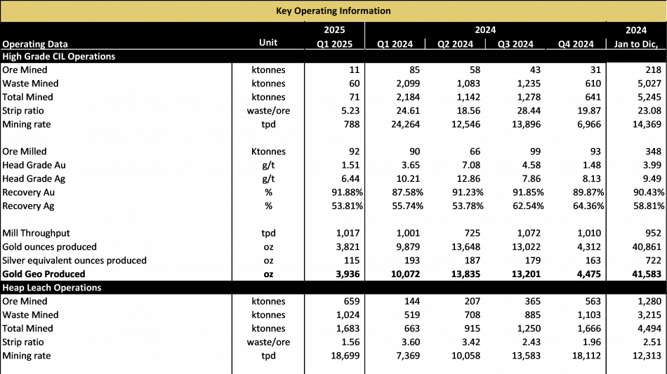 Operational results for Q1 2025 showed a modest improvement in production over the previous quarter, driven by the ongoing ramp-up and transition to a focus on heap leach production as the high-grade ore feed for the CIL plant has been depleting as we await ongoing exploration activities. The CIL plant will continue to process lower-grade stockpiles until underground operations at Paloma are initiated in Q3 2025 with development commencing in Q2 2025. The heap leach operational performance continued to improve over the quarter, reaching record production levels as more ore was added to the pad. The performance of the heap leach continues to improve, exiting the quarter at near full capacity.