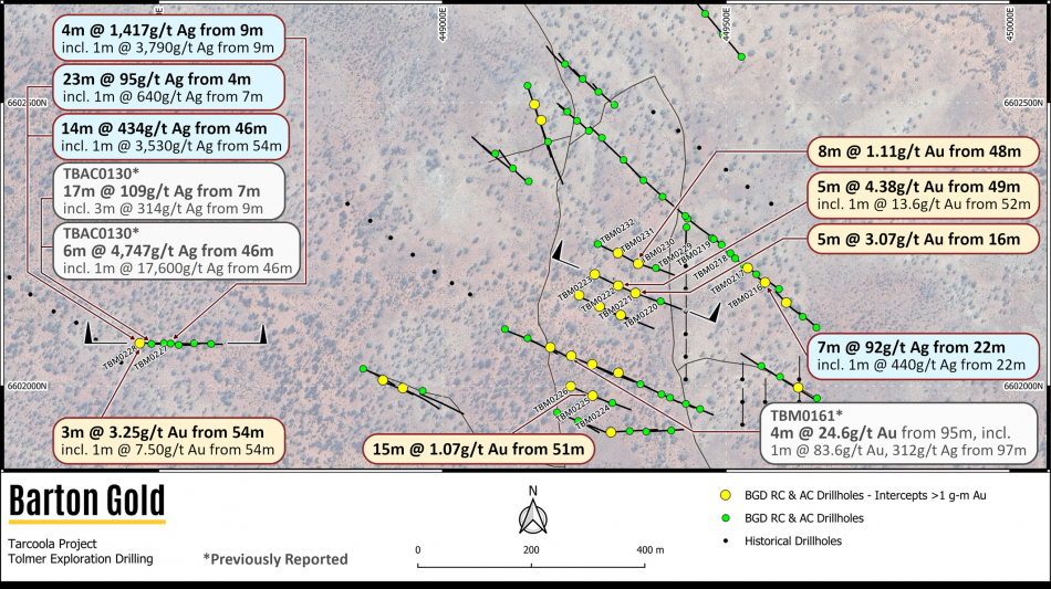 Dual high-grade silver and gold zones recently identified at the Tarcoola Gold Project's ( Tarcoola ) 'Tolmer' prospect, with assay grades up to 17,600g/t Ag and 83.6g/t Au (respectively) 1